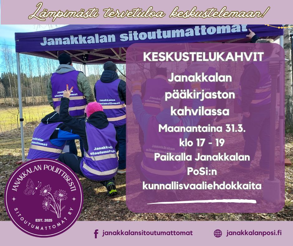 Keskustelukahvit: Janakkalan pääkirjaston kahvilassa ma 31.3. klo 17-19.