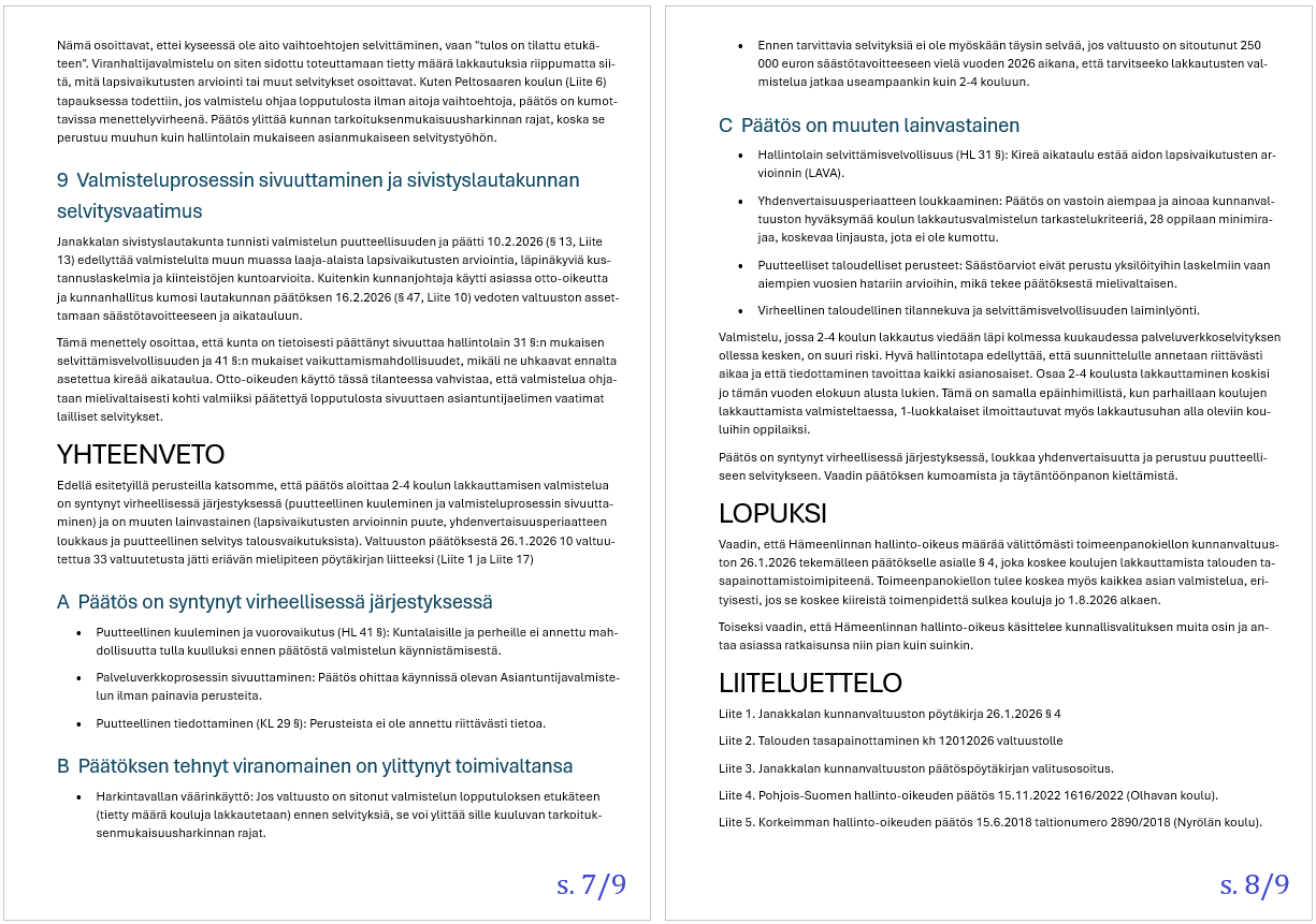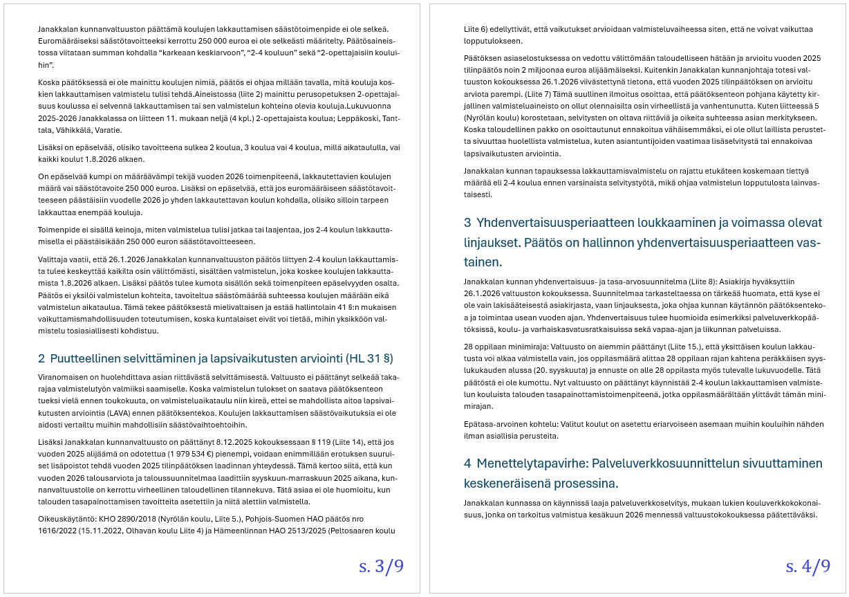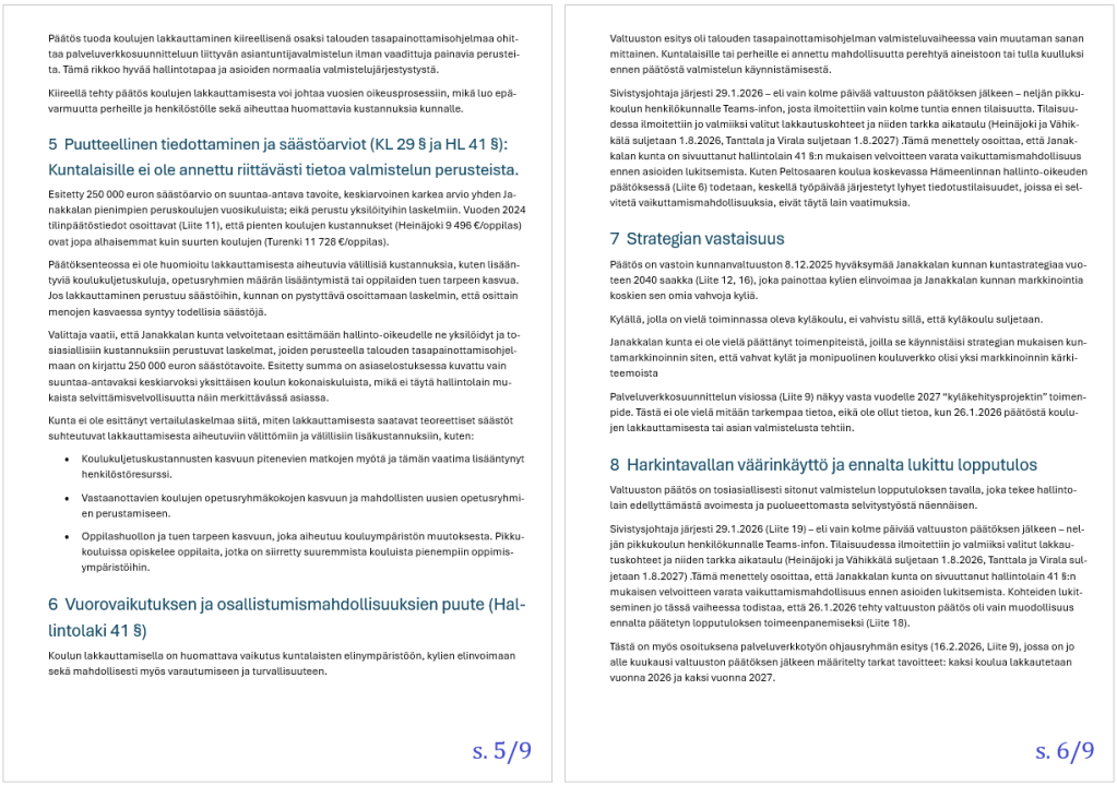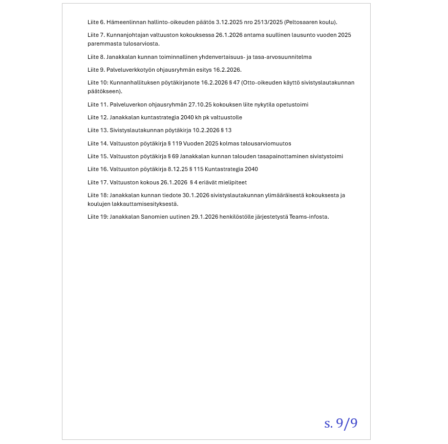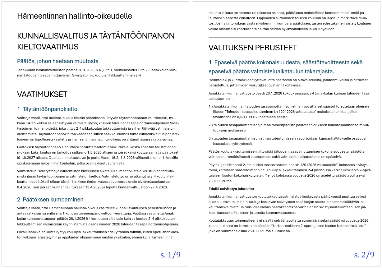 Janakkalan poliittisesti sitoutumattomien taustahenkilö on tutkinut Janakkalan kunnanvaltuuston 26.1. tekemää päätöstä talouden tasapainottamistoimista. Erityisesti säästötoimenpide koskien 2-4 koulun lakkautusta on ollut päätöksenä sen kaltainen, että laajempi perehtyminen asiaan on johtanut kunnallisvalitukseen. Se tullaan osoittamaan Hämeenlinnan hallinto-oikeudelle alkuviikon aikana.