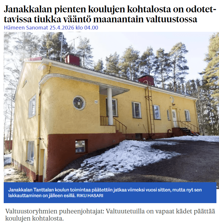 Hämeen Sanomien toimittaja lähestyi jo aiemmin kaikkien Janakkalan kunnanvaltuuston ryhmäpuheenjohtajia liittyen valtuuston 27.4.2026 koskevaa 2-4- koulun lakkauttamista koskevaa artikkelikokonaisuutta.